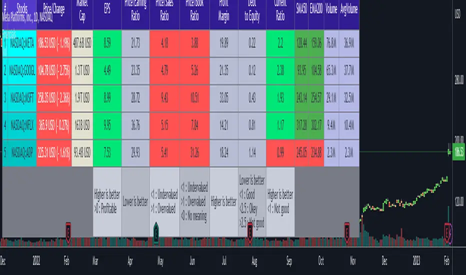 First of all, as we have limitation on security calls, the indicator can get and compare financials for 5 companies only. also Chart time frame must be 1Day or higher! (I recommend 1Day time frame). if not then the indicator stops and shows the error message: "Please set the time frame 1Day or higher". More important than others: You should choose the companies from the same sector! Compare apples to apples :)