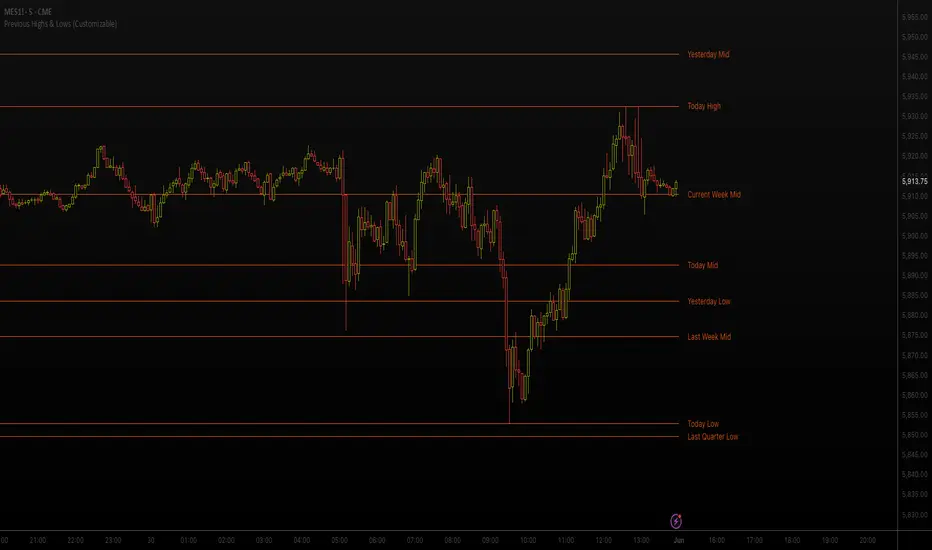 This Pine Script indicator displays horizontal lines and labels for high, low, and midpoint levels across multiple timeframes. The indicator plots levels from the following periods: