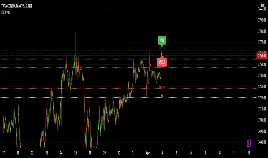 Day's high and low with Candle high low. It shows high and low of the day. Previous candle high and low is shown.