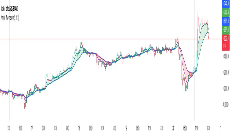 The Dynamic EMA Crossover indicator is designed to help traders identify trend transitions, visually understand market direction, and detect sideways consolidation zones. It simplifies decision-making by dynamically changing colors and highlighting areas of interest.