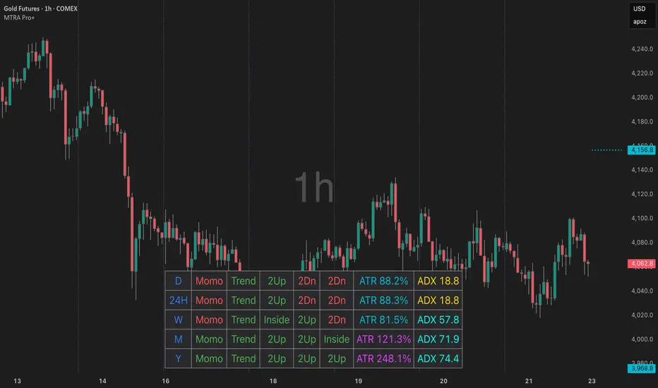 MTRA Pro+ is a comprehensive multi-timeframe analysis tool designed to provide traders with critical market structure information across six different timeframes. This indicator consolidates momentum direction, trend analysis, range relationships, and volatility metrics into a single, customizable dashboard.