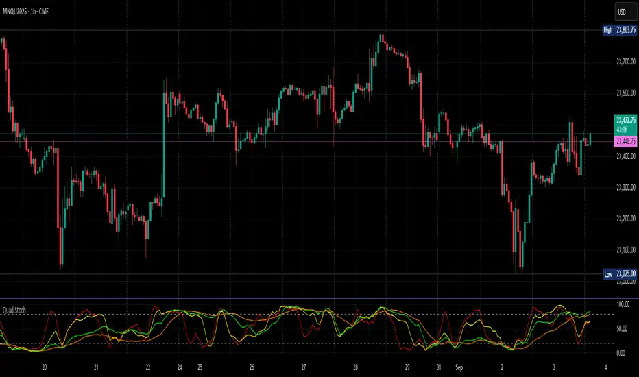This is my take on the "Quad Rotation Strategy". I tweaked and combined the 4 stochastics in one pane to better see the rotation and divergences. %k line is off by default but can be used as an early warning, however it should be set to dotted line so it doesn't obstruct your view. Quad rotations should be taken with divergence confirmation. That can be at the same time or the divergence could come shortly after the quad rotation. Divergences work best at the end of the trend. Divergences on a strong trend are low probability, look for weakness. Yellow line divergences are stronger than the more common red line divergence. Stochastics can diverge from price action or each other. The slow orange line identifies the trend, it can signal change of direction or keep you from closing a trade too early. If the fast red line changes direction, but the orange line does not, the red will snap back in most cases. When all 4 stochastics get pegged overbought or oversold, look a top or bottom followed by a reversal. I've added my own things to look for like the fan pattern, bounces off the orange line, and rejection inside the 80 and 20 lines.Open-source script