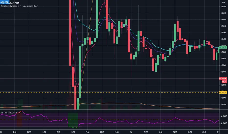 I recently found out about McGinley dynamic and its capability to respond better to market's speed changes when compared with EMA. I was doing some tests on previous charts and I've noticed that according with the risk you want to take there are different intervals which can suits you. For example MG3 is very responsive, I've noticed that it's better if you want to enter long positions, on the other side is unreliable for shorting. Mg10 is instead the slower one but I've noticed is perfect for shorting and opposed to Mg3 tends to identify upper trends too late making the investor losing profit. I've introduced Mg7 to make comparison with the others, when you're uncertain between 3 and 10 you can compare them with the 7.