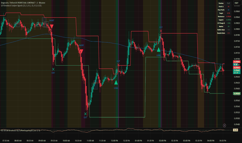 stratbynickAutomatically detects pivot-based S/R levels and enters LONG on resistance breakouts or SHORT on support breakdowns when momentum confirms (2+ consecutive candles + strong body). Filters out choppy markets (tight S/R range <0.5%) to avoid whipsaw losses. Features 6 exit types: stop loss (-0.25%), take profit (+0.5%), trailing stop, momentum reversal detection, early exit on failed setups, and failed breakout protection. Visual signals: green triangles (long), red triangles (short), X markers (exits), color-coded backgrounds for market conditions, plus live profit tracking table.