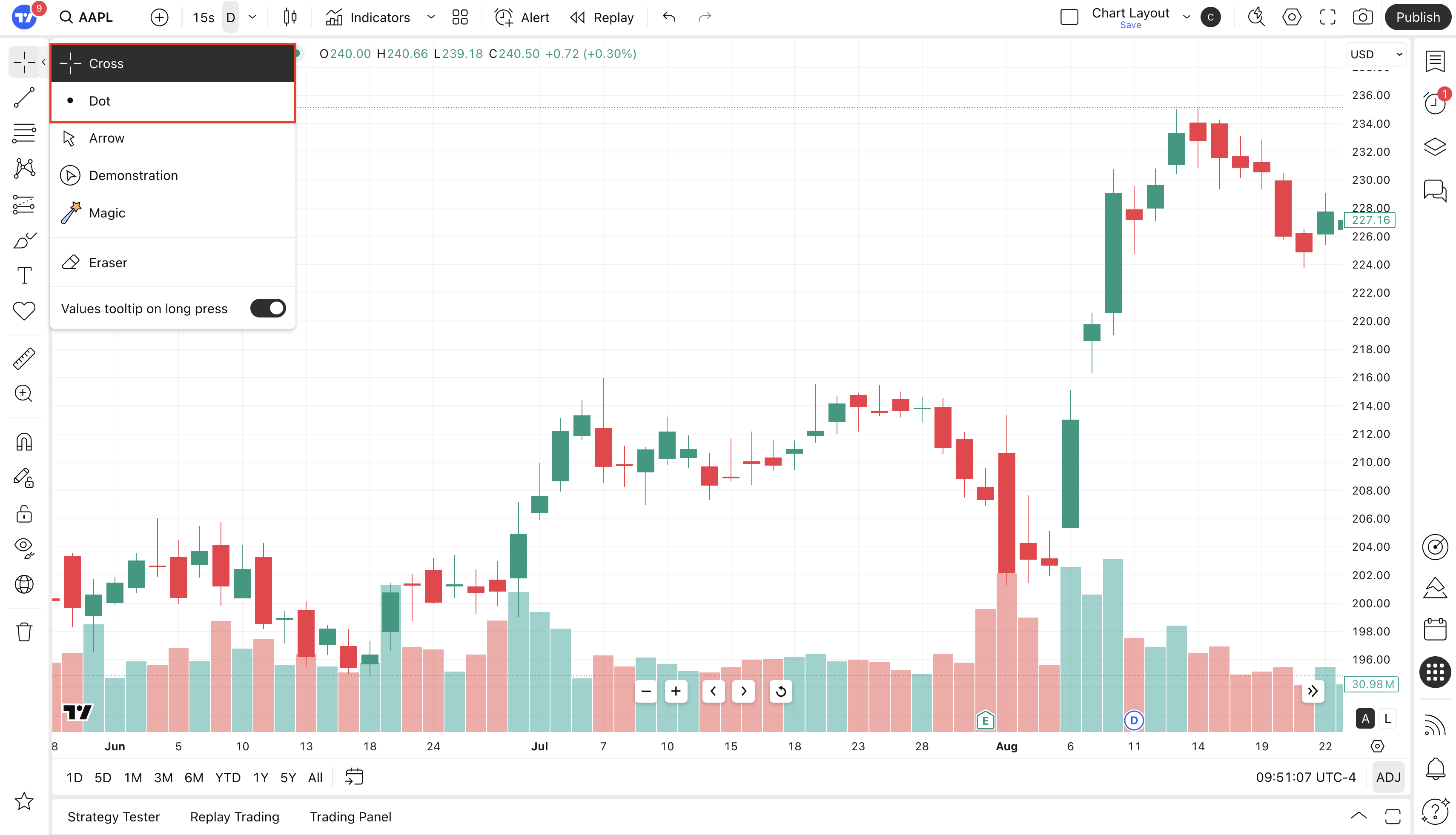 You are likely not seeing the crosshair line because you have selected a cursor type that doesn’t support it. So far, only “Cross” and “Dot” cursor types support the crosshair, while "Arrow" and "Eraser" types do not.