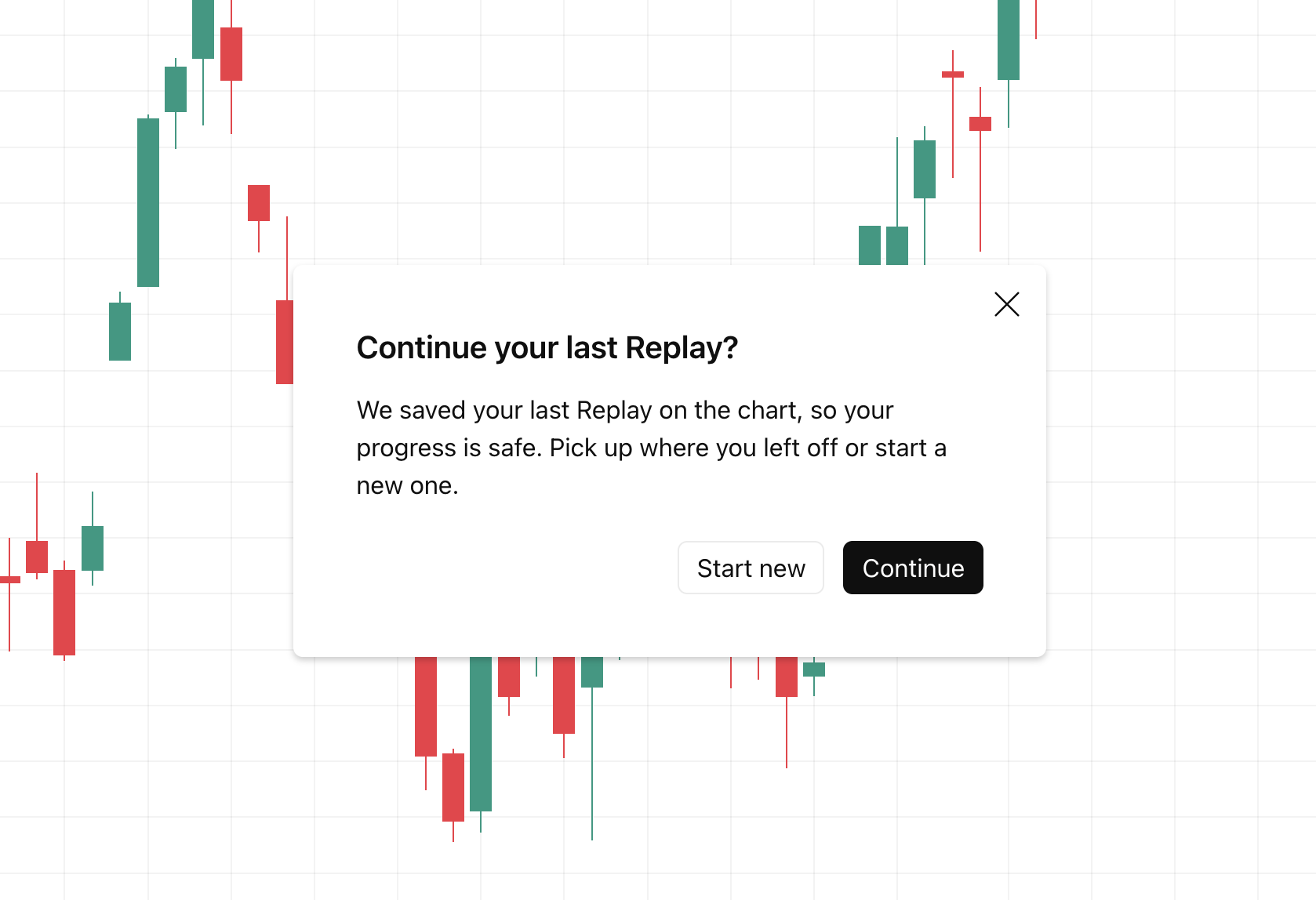 Bar Replay automatically saves your current session when you exit. The next time you open it, you can either continue from the same point with the same symbols and intervals, or start a new session from a different starting bar.