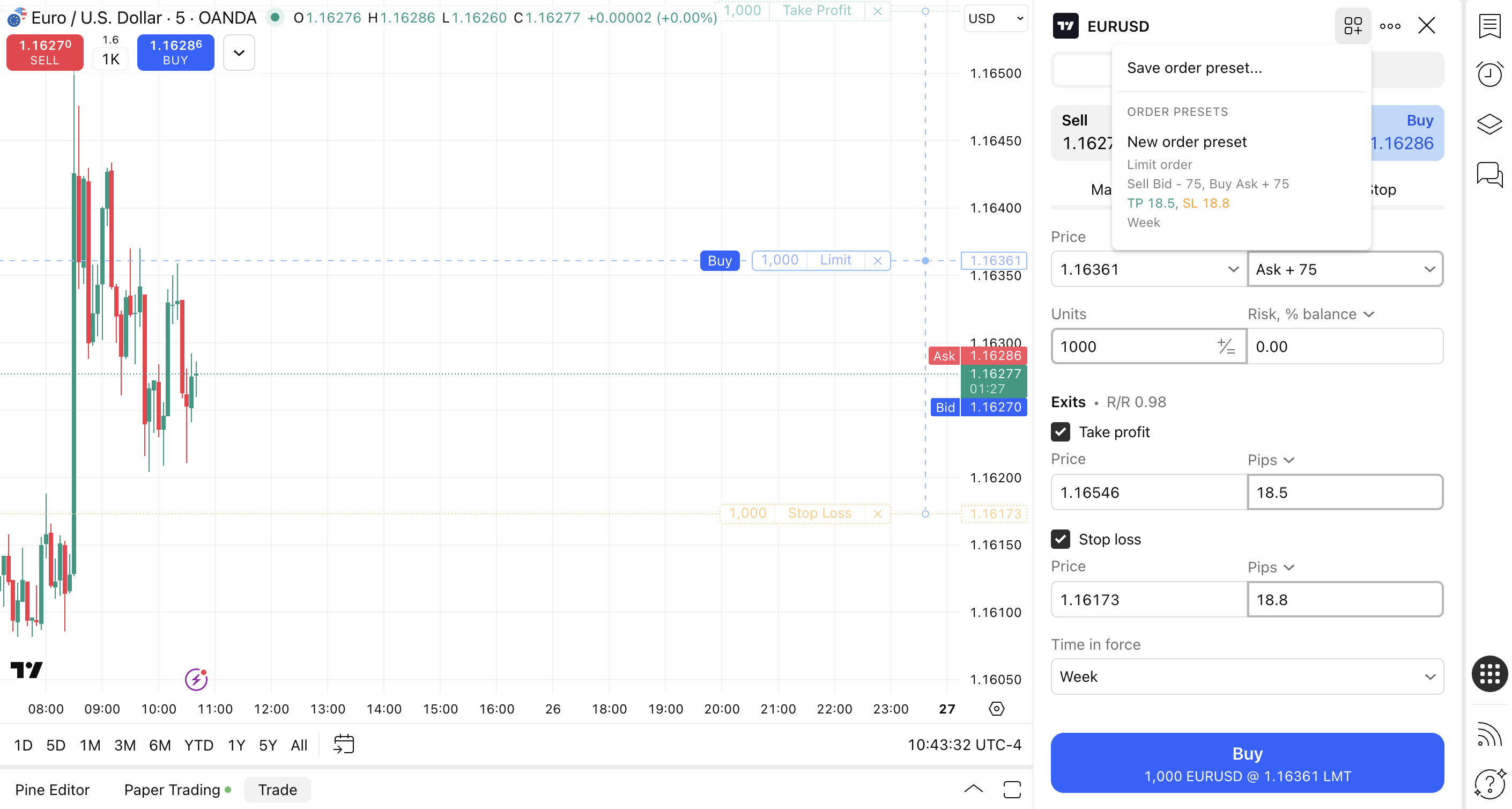 4. If the preset is applied in the Buy/Sell buttons in the Placing orders with confirmation mode, when you click on the button, the Order Window will open with the applied Order preset. However, the Order preset is not applied when opening it from the Trade button.