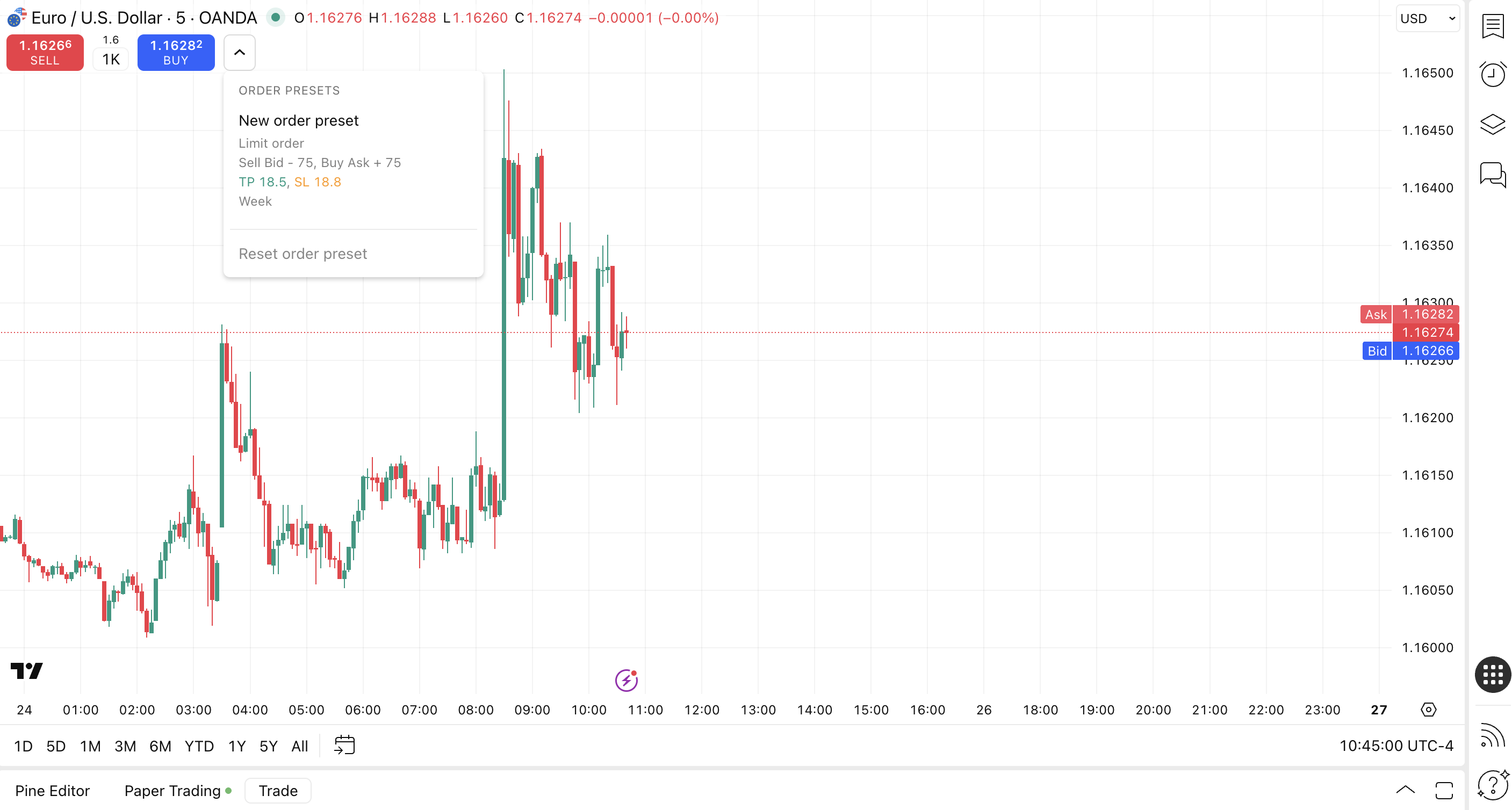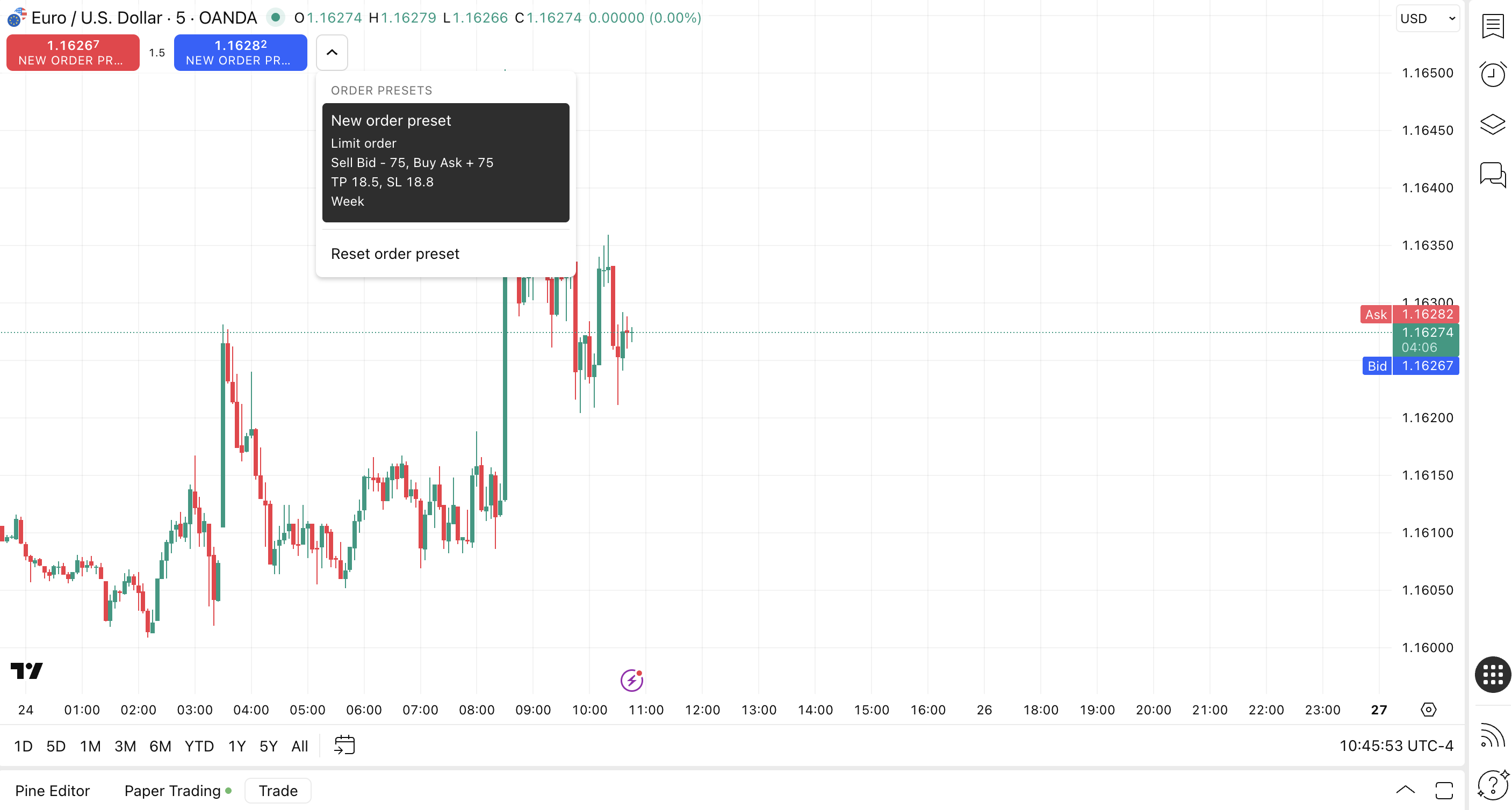 2. If you have a saved preset, the preset menu button will appear next to your chart's Buy/Sell buttons.