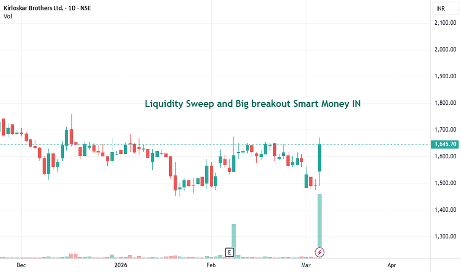 KIRLOSBROS Swing ScenarioAfter a consolidation KIRLOSBROS is forming a reversal scenario. Price showing strength with heavy volume and developed a POI. We need to wait for price to retrace till this zone and show reversal signal.