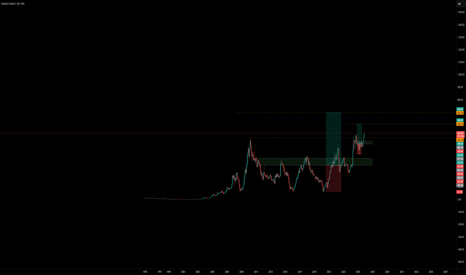 Vedanta (M): Bullish, but at a critical decision point.The stock is currently consolidating in a tight range after a historic, multi-decade breakout. The price is now coiling for its next major move. The key is whether the old resistance at ₹490 holds as new support.